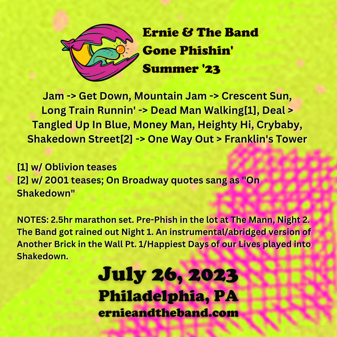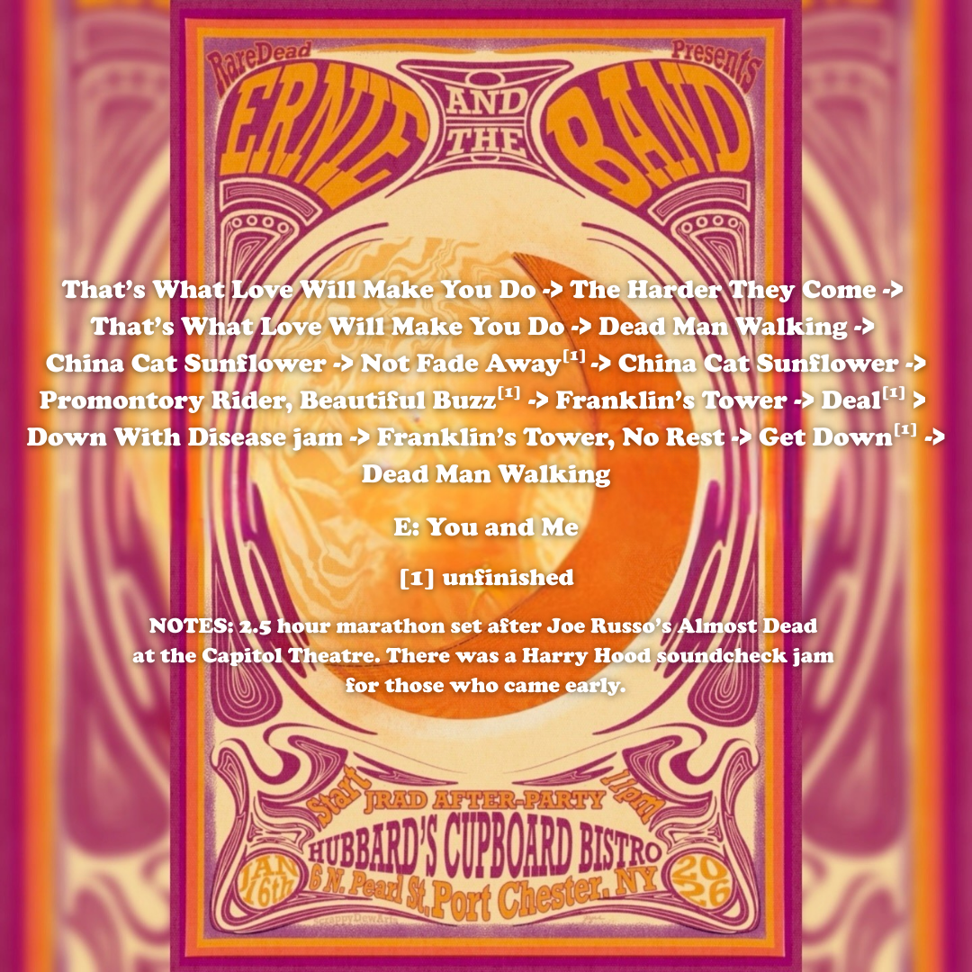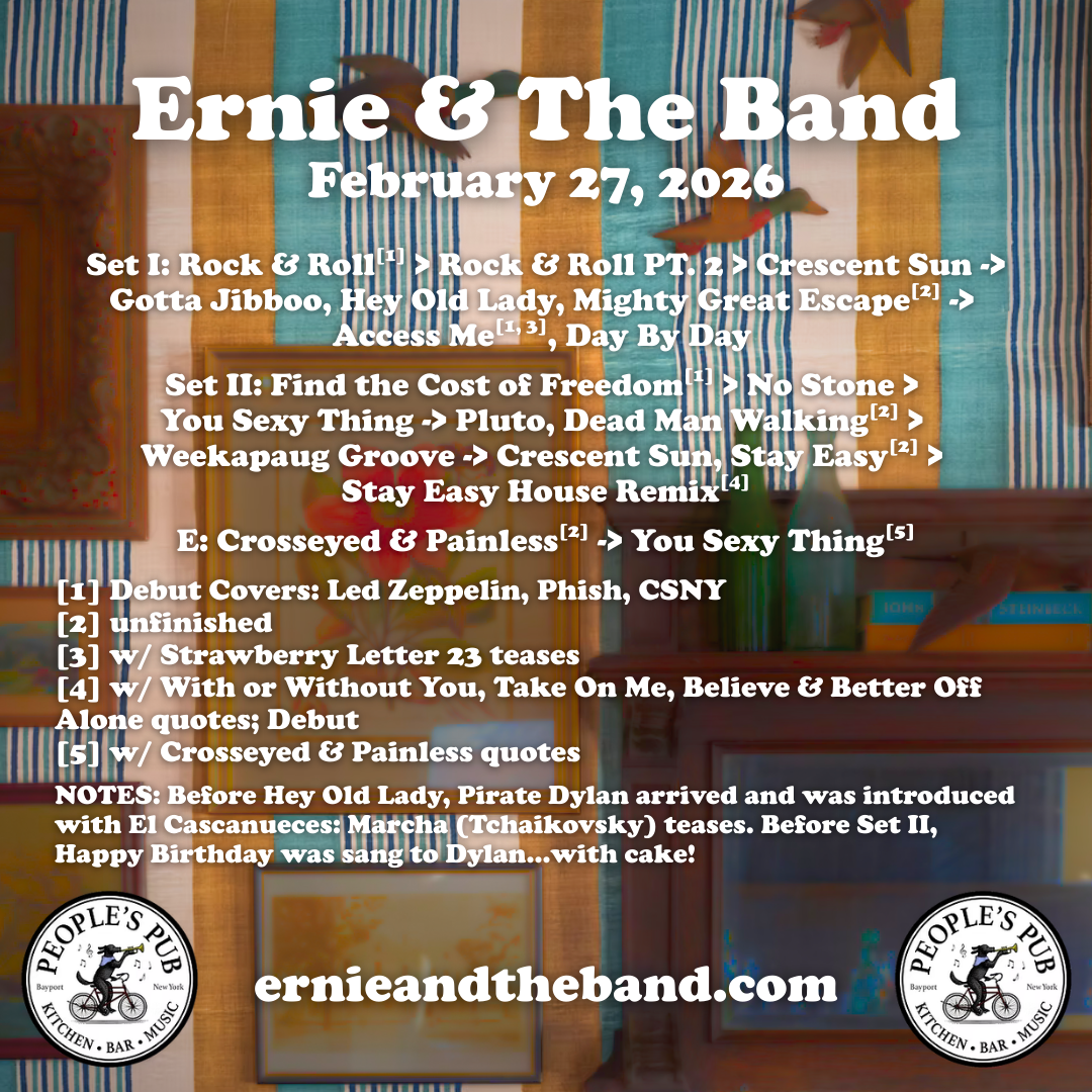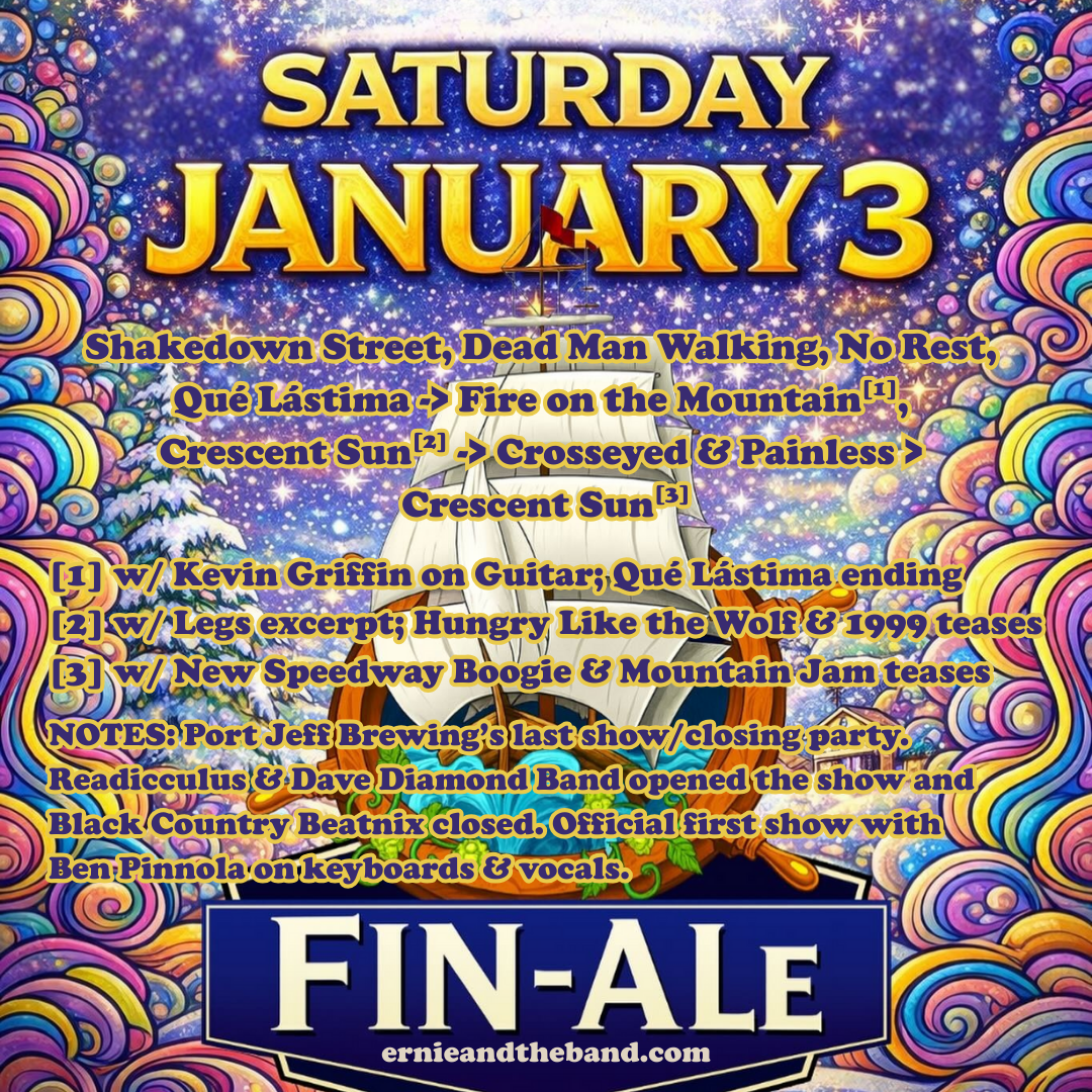 NOTES: Sunshine of Your Love tease by John & Nick before Dead Man Walking. Doodles & Oph performed during setbreak. Brief sword fight with the Birthday Pirate before Shakedown Street. (couldn’t fit this on the graphic!)