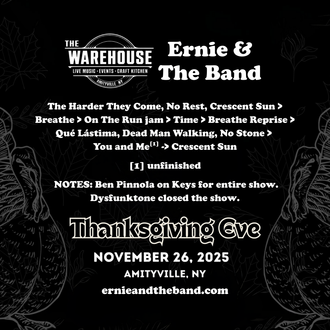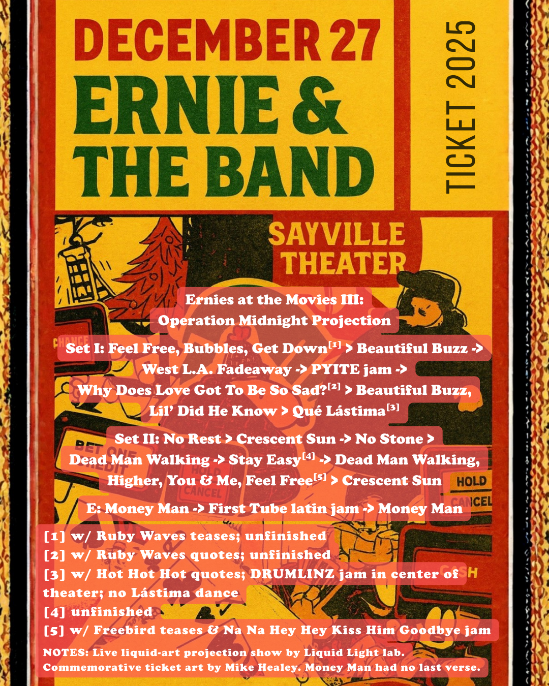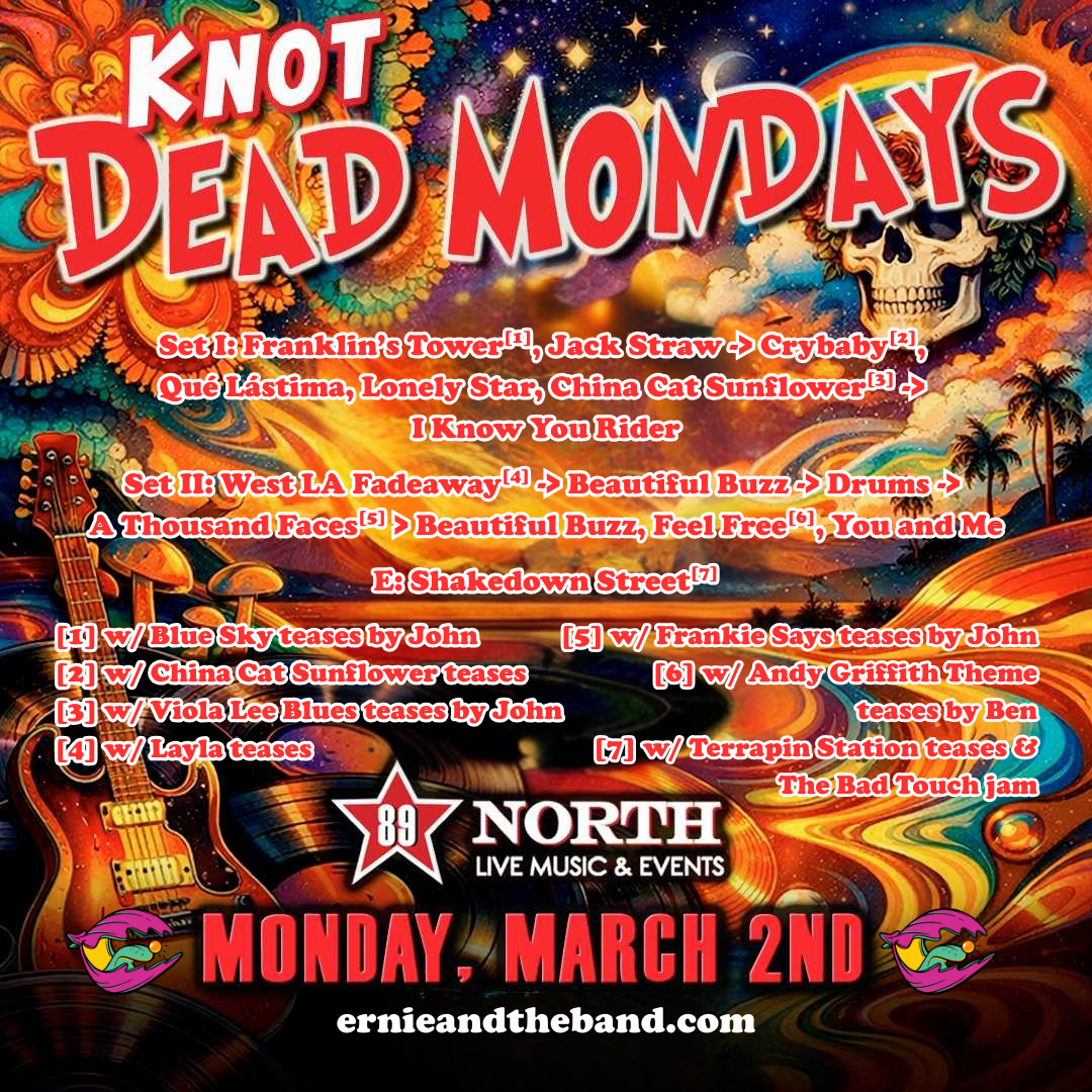 NOTES: Sunshine of Your Love tease by John & Nick before Dead Man Walking. Doodles & Oph performed during setbreak. Brief sword fight with the Birthday Pirate before Shakedown Street. (couldn’t fit this on the graphic!)